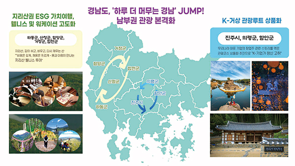 경상남도는 지난 2월 24일 창원컨벤션센터 회의실에서 도와 시군(진주시·의령군·함안군·하동군·산청군·함양군·거창군·합천군), 경남관광재단이 참여하는 ‘남부권 광역관광개발 진흥사업’의 업무협약을 체결했다.협약식에는 도 및 시군 관광개발 담당 국·과장과 경남관광재단 대표이사 등 관계 공무원 30여 명이 참석했다. 이번 협약을 통해 남부권 관광자원을 권역 단위로 연계하고, 콘텐츠 개발과 홍보까지 사업 전반을 체계적으로 추진할 계획이다.협약에 따라 추진되는 주요 사업은 K-거상 관광루트 상품화, 지리산권 ESG 가치여행 특화상품 육성, 지