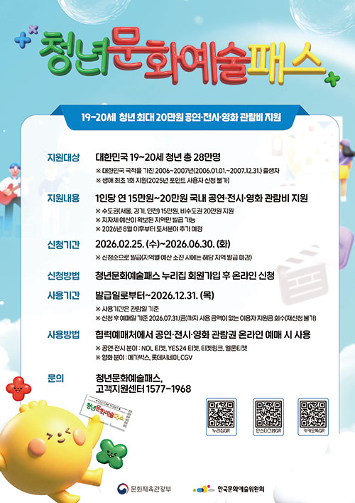 양산시는 올해 19~20세인 2006~2007년생 2,000명을 대상으로 ‘청년 문화예술패스’를 1인당 연 20만 원을 지원한다.‘청년 문화예술패스’는 협력 예매처인 NOL티켓, YES24티켓, 티켓링크, 멜론티켓, 메가박스, 롯데시네마, CGV에서 공연과 전시, 영화 예매에 즉시 사용할 수 있는 이용권으로, 2월 25일(수)부터 신청할 수 있다.2024년 처음 시행한 ‘청년 문화예술패스’는 청년이 적극적인 문화소비 주체로 성장할 수 있도록 문화예술 관람을 지원하는 사업이다.올해 지원 대상은 2006~2007년생이다. 신청일 기준