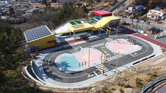 나무·돌 가득한 숲소리 공원 내 조성넓은 외부 교육장 구성·경사진 지형흥미 유발 등 다양한 고민 끝에 설계안전하고 즐거운 체험 공간으로 탄생설계 의도거제 어린이 교통공원은 거제 숲소리공원 내 경사진 부지에 조성되었다. 나무와 돌이 가득한 한적한 공원 속에서 어린이를 위한 시설을 설계하는 것은 쉽지 않은 과제였다. 어린이들의 흥미를 유발하는 방법, 넓은 외부 교육장의 구성, 경사진 지형을 효율적으로 활용하는 방안, 그리고 안전한 공간 조성 등 다양한 고민이 설계 과정에서 함께했다.이 교통공원의 가장 큰 특징은 자연 속 산지에 위치한