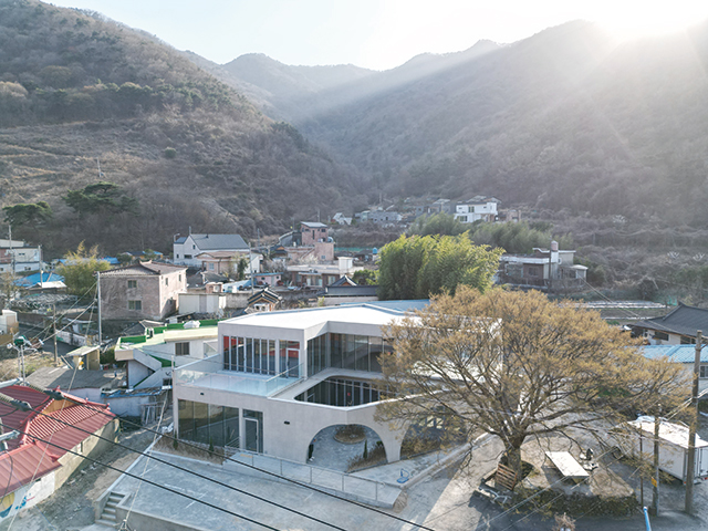 단순히 상업과 이용을 위한 공간을 넘어 ‘마을의 일상 속에 조용히 스며드는 건축’을 지향했다. 배치부터 외관까지, 기존 마을조직에의 존중을 기본으로 하되, 새로운 활기를 유입할 수 있는 열린 구조로 계획됐다. 대지 전면의 커다란 느티나무와 마당은 마을 주민과 방문객 모두에게 열려 있으며, 곡선의 아치가 그 경계를 유연하게 만든다.산자락 아래, 마을의 풍경과 나란히 놓인 이 건축물은 단순한 형태 너머로 공간이 지닌 시적 깊이를 드러낸다. 매스의 절제된 구성과 곡선의 유연한 도입, 그리고 하늘을 향해 비워낸 천장의 타공은 이 건축이 단