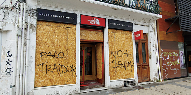 내일 새벽 막달레나 섬 펭귄 투어 예약을 하고 푸에르토 나탈레스로 가는 버스표 예매를 한다. 4박을 예약한 호텔에서 2박만 묵고 떠나기로 한 뒤, 반 토막이 나버린 푼타아레나스의 시간 안에서 우리가 할 수 있는 것을 하자며 비가 흩날리는 거리로 나선다. 날씨 탓인지, 아르헨티나 국경 폐쇄 소식 때문인지 발걸음에 힘이 실리지 않는다. 쇼윈도 대신 종이박스를 테이프로 붙여놓은 구둣가게, 셔터를 반쯤 내린 채 손님을 기다리는 점원, 검은 페인트칠이 된 상점의 문 위에 갈기듯 쓰인 낙서들은 흡사 전쟁을 치른 모습이다. 최루탄 가스 냄새가 바람결에 느껴지는 푼타아레나스가 을씨년스럽다.