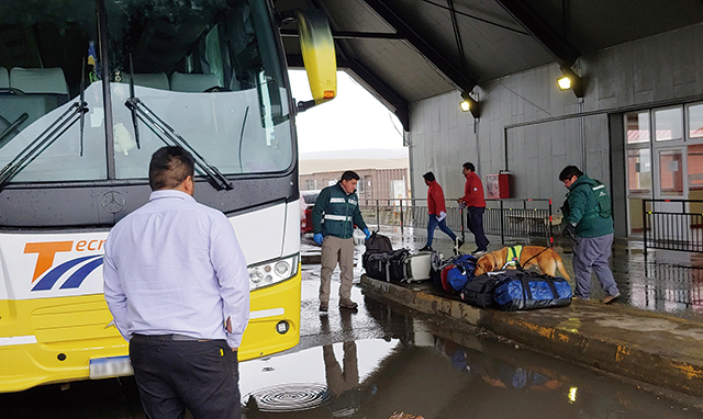 개가 짐에 코를 박고 킁킁거릴 때마다 총을 찬 검역관은 만족한 얼굴로 ‘Muy Bien(매우 잘했어)’을 외친다. 개가 뒤적거린 짐은 검역관이 따로 짐 검사를 한다. 마약견이 아니라 농산물을 찾는 개다. 농산물은 칠레 입국 시 금지 물품이다. 우리도 먹다 남은 바나나를 아르헨티나의 마지막 휴게소 쓰레기통에 버렸다. 칠레 입국 소에 도착하니 검역관이 개를 데리고 버스에 탄다. 개는 버스 안의 좁은 통로를 다니며 승객들 쪽으로 기웃거리며 킁킁거린다. 개의 1차 검역이 끝난 후 우리는 화물칸에서 각자의 짐을 꺼내 들고 검역소 사무실로 간다. 각자의 짐을 바닥에 놓고 짐 뒤에 서서 기다린다. 타원형으로 짐들이 놓여 있고 짐 뒤에 사람들이 빙 둘러싸고 있다. 거리공연이라도 구경하는 기분이다. 검역견의 등장은 긴장이 아니라 여행자들에게 재미있는 볼거리를 제공한다. 민주는 검역견과 사진 한 컷을 찍고 좋아한다. 10시간이면 도착할 거리가 12시간이 걸리는 데는 다 이유가 있었다.