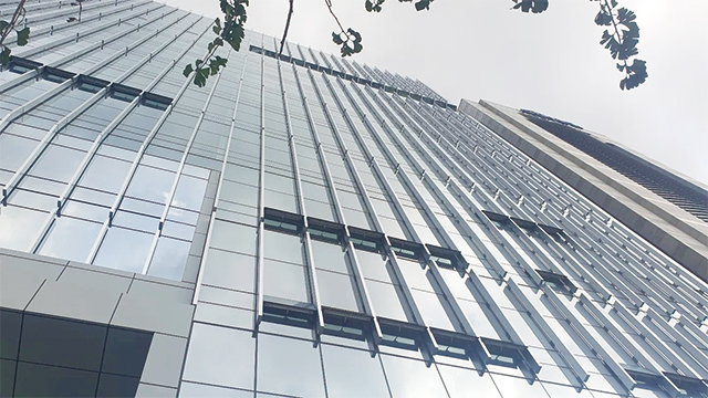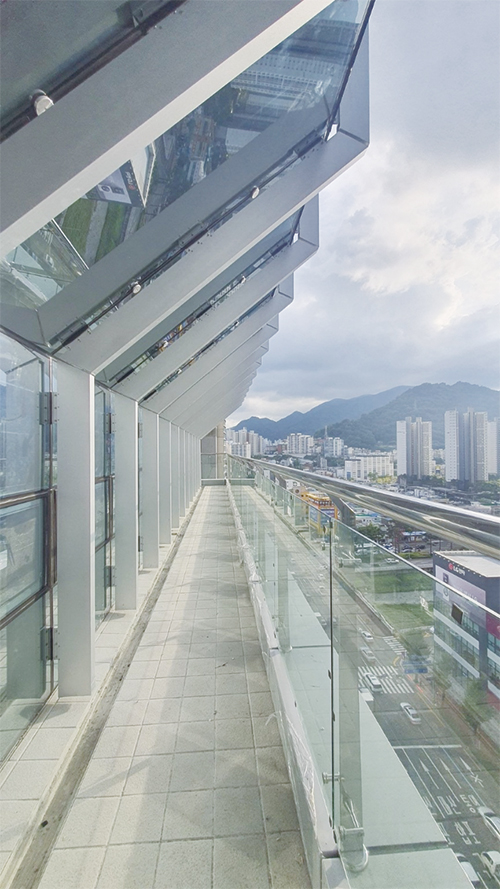 외부 마감 시스템 중 가장 핵심이 되는 요소는 전면 입면의 유리 커튼월과 수직의 루버로, 커튼월은 공장 제작 모듈러 시스템으로 설계돼 현장 설치 오차를 최소화했고, 실리콘 이중 접합 방식과 유닛 간 간섭 최소화를 위한 조립 시퀀스가 사전 검토됐다.
