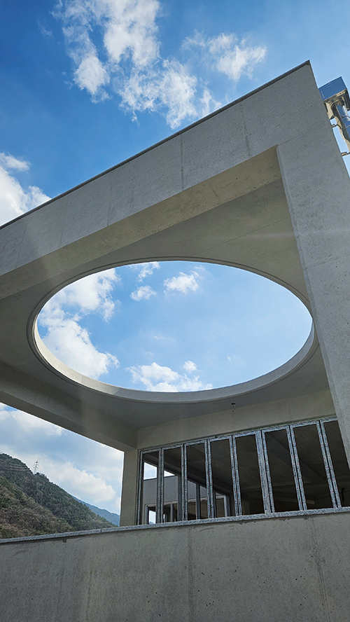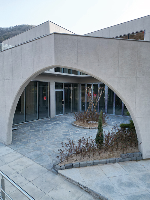 매스의 조합이나 평면의 효율보다 비움과 채움의 리듬을 통해 공간감을 창출한다. 수직적으로는 타원형의 ‘하늘창’을 통해 하늘과 산, 빛을 끌어들이고, 수평적으로는 아치형 구조를 통해 흐르는 듯한 시선의 연속성을 만든다.