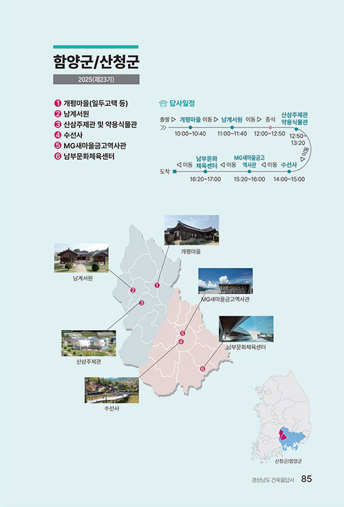 각 답사 코스는 이동 동선과 주요 장소를 체계적으로 정리해, 전문 지식이 없는 도민도 책자를 통해 답사 일정을 따라가며 경남의 건축을 체험할 수 있다. 건축물의 배경과 특징, 공간적 의미도 담아 교육 자료이자 실용적인 안내서로서 활용도가 높다.