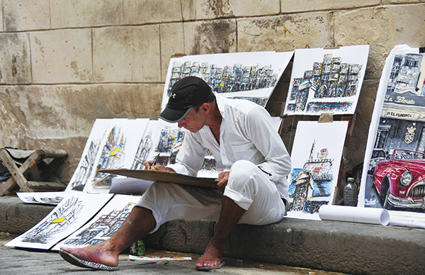 이제 이 골목은 나에게 더 이상 헤밍웨이 모히또 맛집이 있는 골목이 아니다. 이 골목은 나의 단골집이 있는 골목이고, 내 친구의 직장이이기도 하다. 쿠바에 온 뒤로 ‘1일 3모히또’를 하기에 나도 ‘라 보데기따 델 메디오’의 단골 자격이 충분히 있고, 그 가게 앞에서 그림을 그리는 거리의 화가는 나의 친구이기 때문이다. 처음 거리의 화가에게 사진을 찍어도 되냐고 물었더니 단호한 표정으로 “NO”라고 말했다. 그 친구가 그림을 그리는 모습을 한참을 지켜보던 나는, “나도 그림을 그린다”고 말했다. 표정이 부드러워진 거리의 화가는 나의 드로잉북을 보며 활짝 웃었다. 이렇게 친해진 거리의 화가는 나에게 사진을 찍는 것을 허락했다. 이제 우리는 서로의 그림 그리는 모습을 보며 엄지손가락을 들어 서로를 응원하는 사이다.